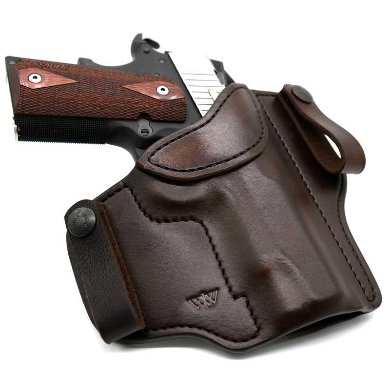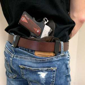 The Banshee features high ride leather belt straps, tuck-able deep concealment clips are also available as an add-on item. Both accommodate up to a 1-3/4" belt widths.
